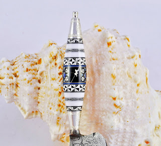 Cuchillo La Palma, serie 8 Islas Canarias. Hoja de acero damasco 1095-15n20 de 16'5 cms y cabo en plata con los colores de la bandera de la isla bonita, La Palma. Lleva incrustado en la pieza central la figura de la isla y dos representaciones típicas de la isla, el enano de las fiestas lustrales y el saltador de La Caldera de Taburiente. Además, en los casquillos se ha burilado los grabados rupestres en espeiral. Longitud del cabo 9 cms.